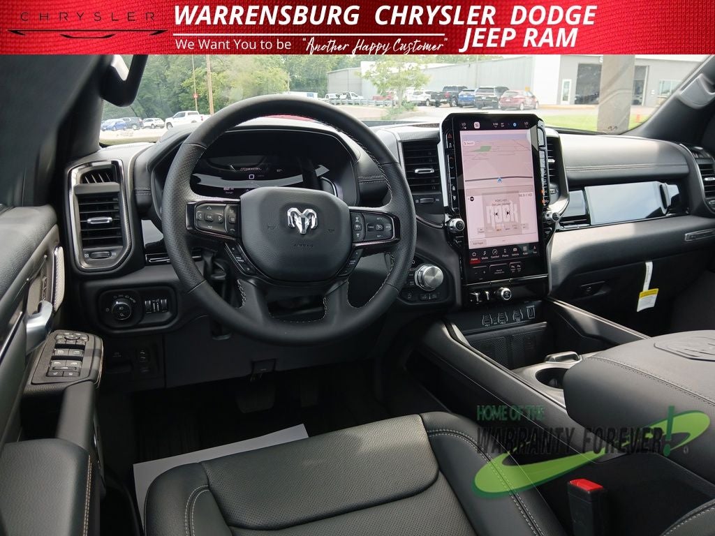 Inside, the cabin includes Uconnect infotainment with available 14.5-inch touchscreen, optional passenger-side display, and modern driver assistance features like adaptive cruise control, lane-keeping, blind-spot monitoring, and forward collision braking