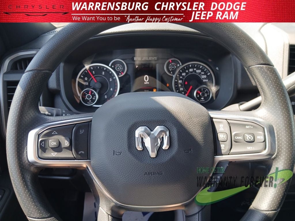 Built for durability, it rides on 17 black steel wheels, heavy-duty suspension, manual mirrors, LED reflector headlamps, and a blacked-out exterior treatment; inside are vinyl front seats, a 40/20/40 bench, manual windows/locks, and a basic but durable cab with Uconnect5 on an 8.4 touchscreen, Apple CarPlay/Android Auto, a trailer brake controller, and safety tech like adaptive cruise, forward-collision warning, and ParkView rear camera