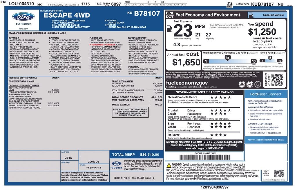 This Escape Titanium stands out with high-demand features like Ford Co-Pilot360 driver assist technology including blind spot monitoring, lane keeping system, and pre-collision assist with automatic emergency braking, along with a hands-free foot-activated liftgate, remote start system, and intelligent access with push-button start for everyday convenience, inside youll find a premium Sony audio system, SYNC 3 with voice-activated navigation, Apple CarPlay and Android Auto compatibility, dual-zone climate control, heated front seats, and a power driver seat for maximum comfort, the panoramic Vista Roof adds an open, airy feel while the rearview camera and reverse sensing system make parking effortless, riding on stylish 19-inch machined aluminum wheels that complete the look,