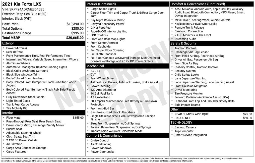 Inside the cabin, the Forte features a clean and practical interior designed for comfort and convenience. Cloth seating, adjustable steering wheel, front center armrest, and full carpet floor covering provide everyday comfort for the driver and passengers. Additional features include power windows, power door locks, cruise control, air conditioning, multiple 12-volt power outlets, and convenient interior storage areas to help make daily driving easier.
