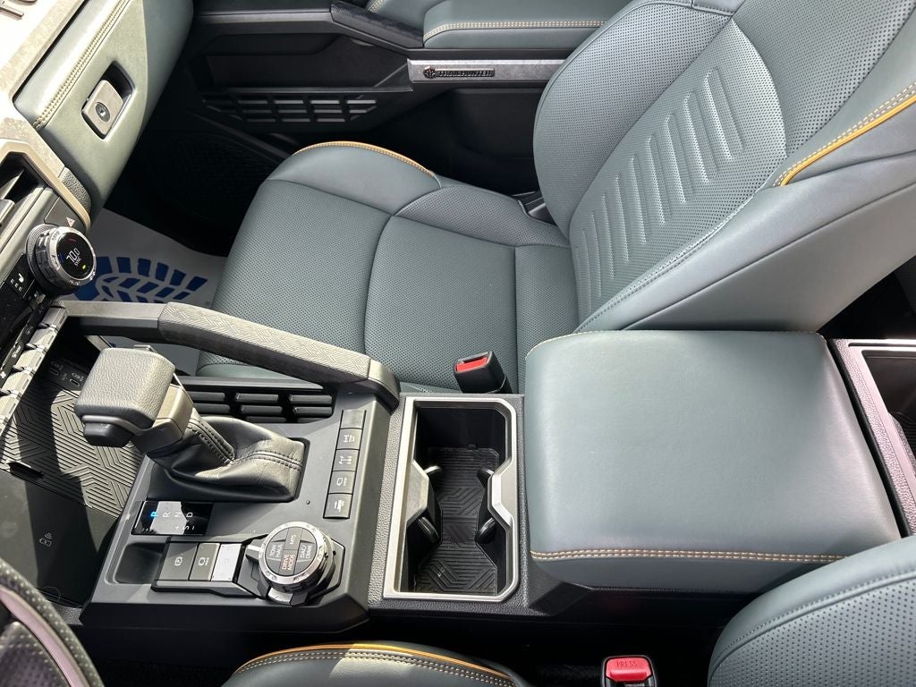 The Trailhunter trim is specifically engineered for overlanding and off-road exploration. Unique equipment includes Old Man Emu forged monotube shocks with remote reservoirs, frame-mounted rock rails, a steel front skid plate, high-clearance trail exhaust, and an ARB sport bar. The bold front end features a Toyota Heritage grille with an integrated LED light bar, while 18-inch bronze-finished wheels and Rigid Industries switchable LED fog lights give the truck a distinctive and functional appearance.